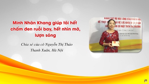 Trong buổi tổng kết “Khảo sát độ hài lòng của khách hàng về Minh Nhãn Khang”, cô Lê Thu Thảo (0912 205 861 – Hà Nội) chia sẻ Minh Nhãn Khang là sản phẩm tốt, đã giúp cô phục hồi đôi mắt sáng rõ,